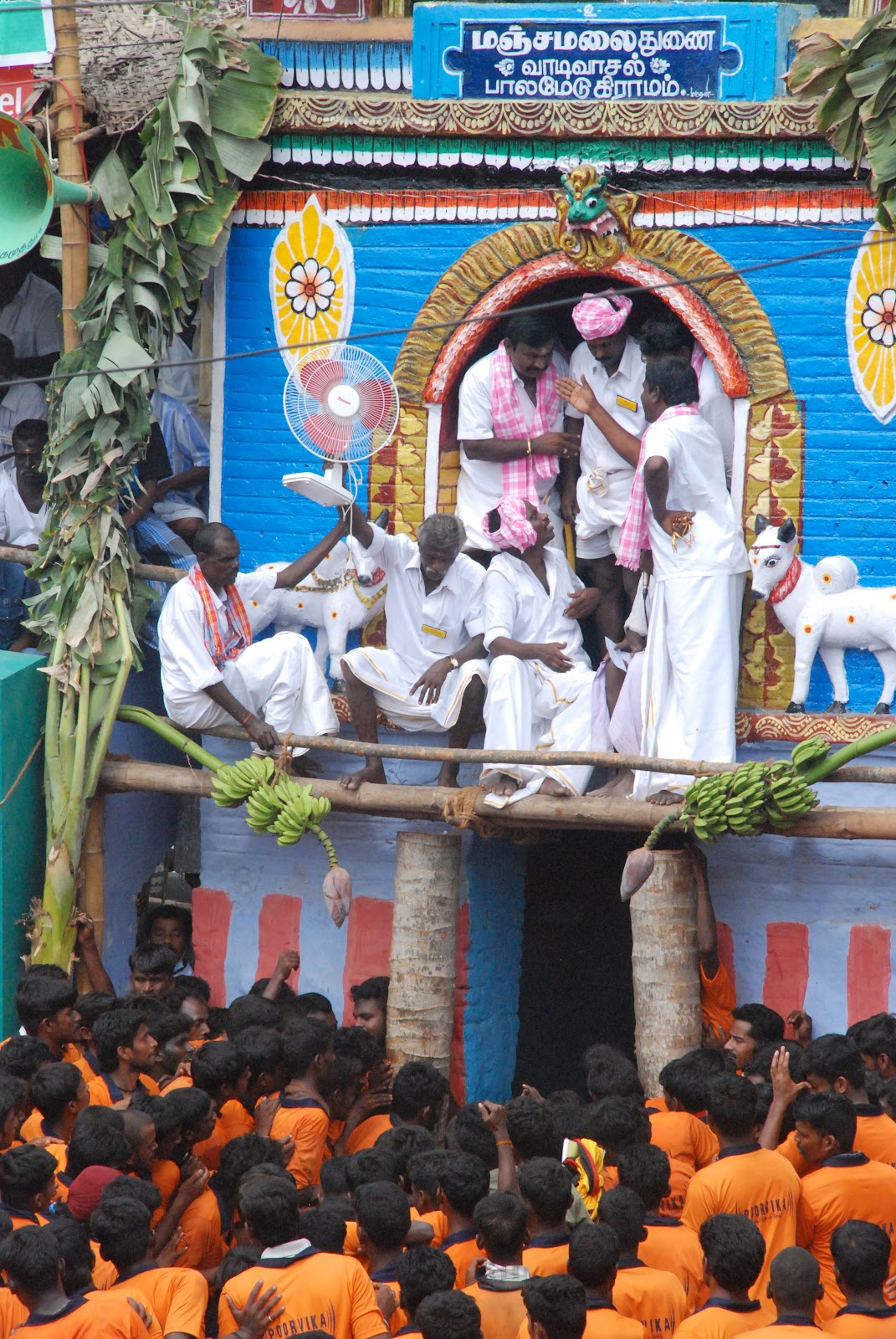 My friend managed to evoke vibrant scenes in my imagination: the crowds cheering from rickety wooden stands as twenty adorned and decorated bulls thundered down a field of dirt, throwing clods of earth into the air, while drivers frantically shouted commands and the ignition men opened and closed their umbrellas when they weren’t using a couple of wires and a car battery to apply a shock to the animals’ flanks; one chariot breaking down, plummeting into the loose soil and splintering into a thousand pieces, the men flying off in a heap and a wooden wheel rolling off into the distance before slowing down and spinning to the ground like a dying top; the finish line where garlands of flowers have been strung, and judges clad in white wave signal flags like semaphore, and a commentator yells an unending stream of who-knows-what into the barely-working, crackling, and, above all, loud sound system; and once the race is over the celebrations of the victorious village and the ensuing, energetic debates over the validity of the win all under a hot sun and a cloudless, blue sky with coconut trees, green crops, and hazy hills in the background.